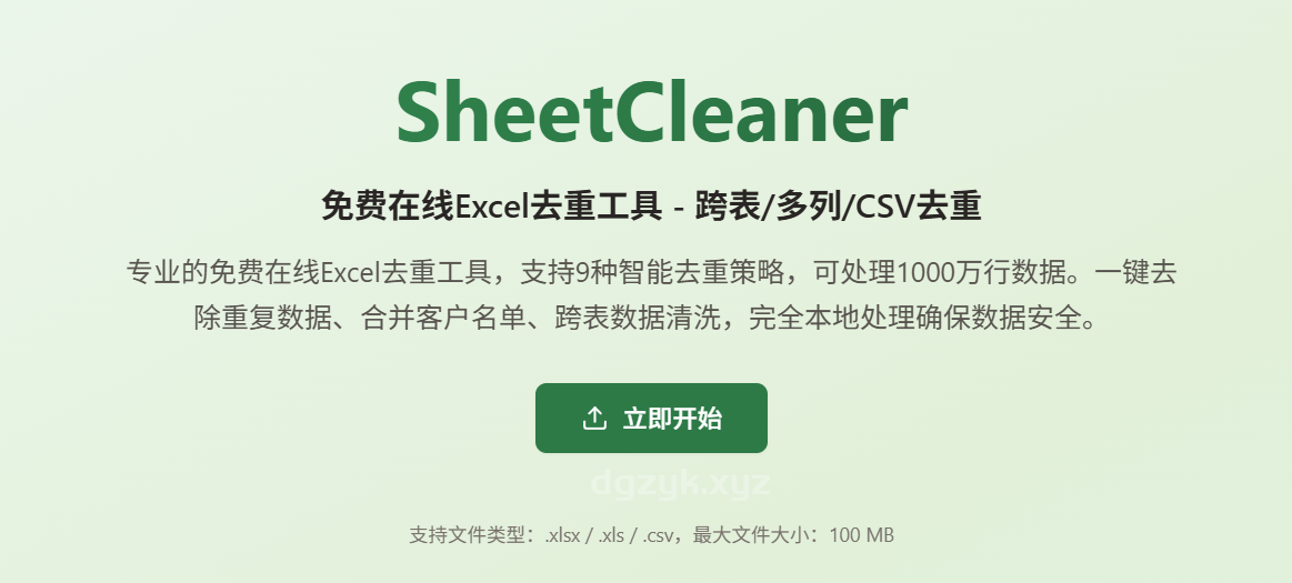 该工具提供9种智能去重策略,支持的文件类型包括.xlsx、.xls和.csv,最大文件大小为100MB,并可处理高达1000万行数据。
