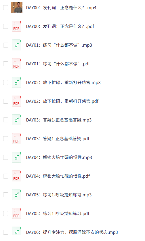 课程内容涵盖了正念的基础知识、呼吸觉知、身体觉知、想法觉知和情绪觉知等练习,以及相应的答疑。