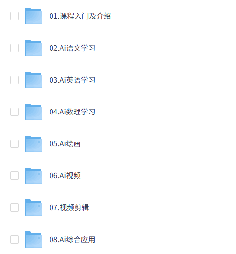 课程大纲包括入门篇、AI语文学习、AI英语学习、AI数理学习、AI绘画与设计、AI视频创作、剪辑与后期、AI综合创作等内容。